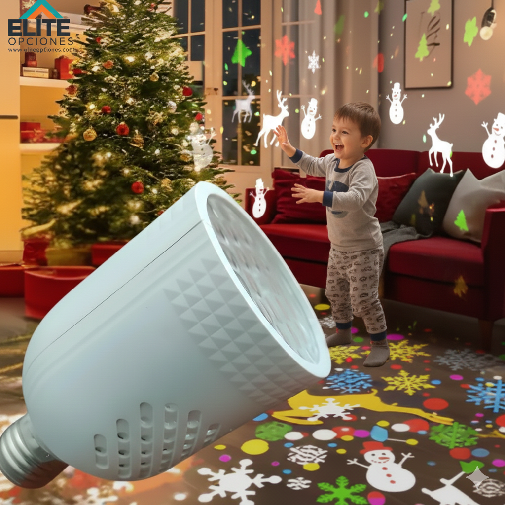 Convierte tu balcón, terraza o jardín en un verdadero espectáculo festivo con el Bombillo Proyector Navideño, la forma más práctica y encantadora de decorar tus espacios al aire libre en segundos.